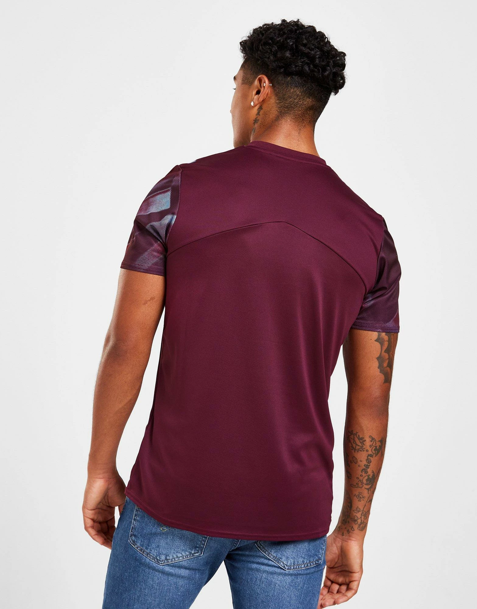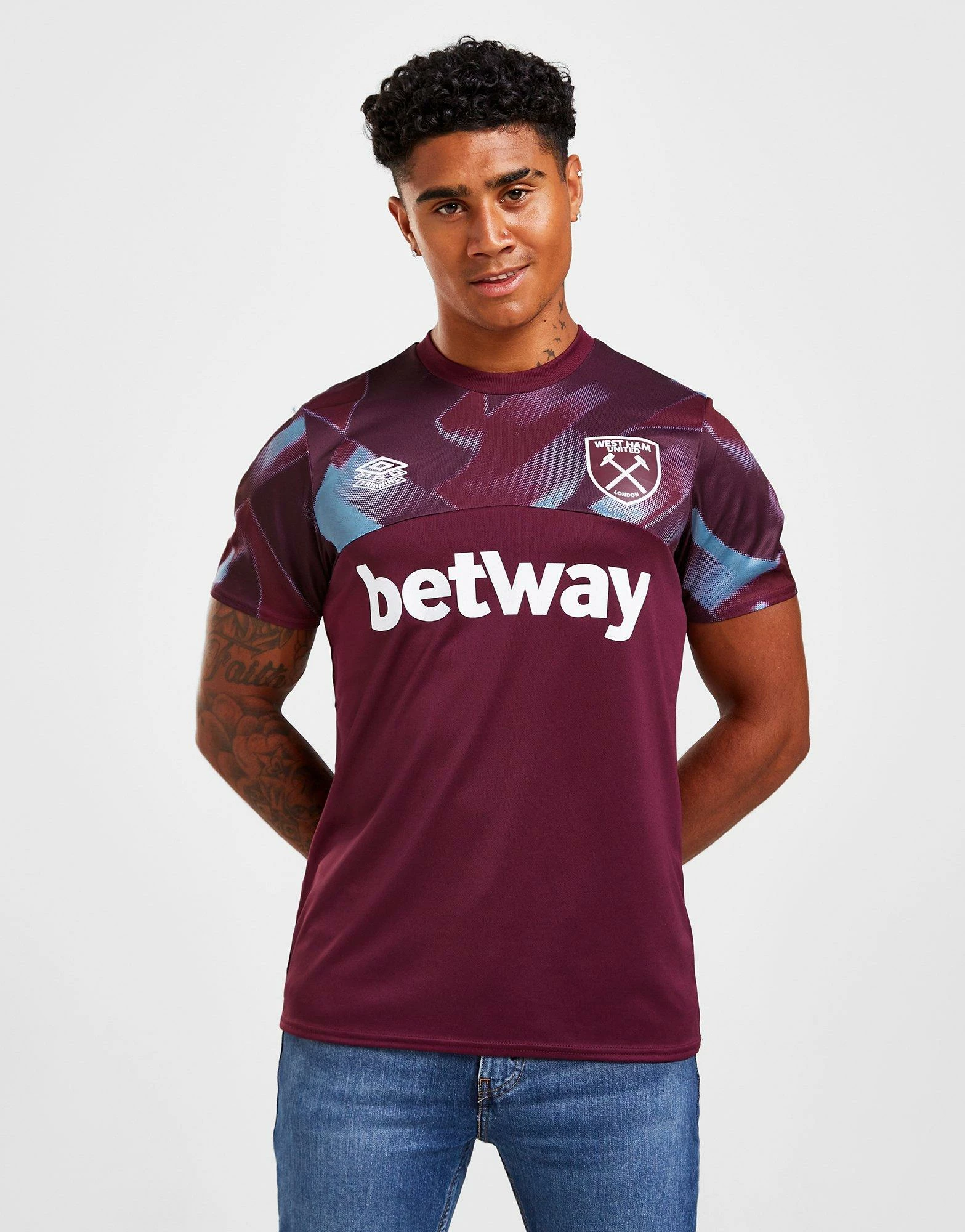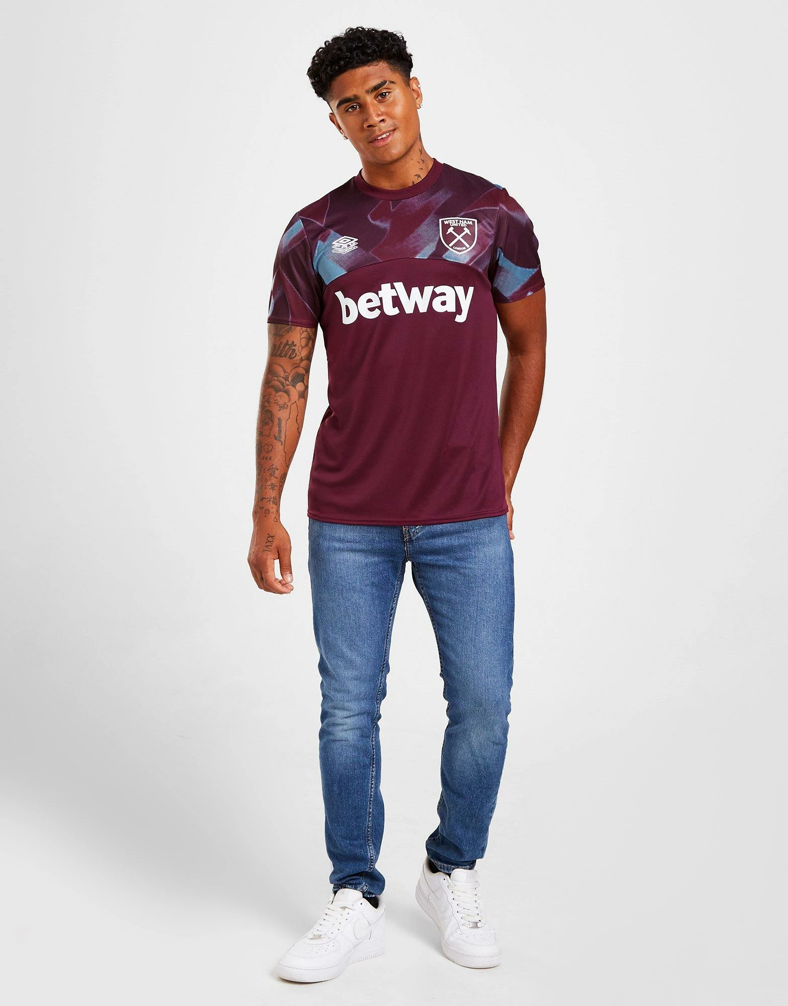 Hit the pitch and rep your side in this men’s West Ham United FC Warm Up Shirt from Umbro. In a Grape colourway with contrasting graphics, this regular-fit shirt is made from lightweight poly fabric for cool comfort. It features a crew neckline and short sleeves. Finished with Umbro branding and the iconic West Ham crest to the chest. Machine washable. | Our model is 5’11” with a 38″ chest and wears a size medium.