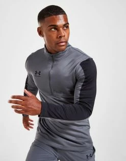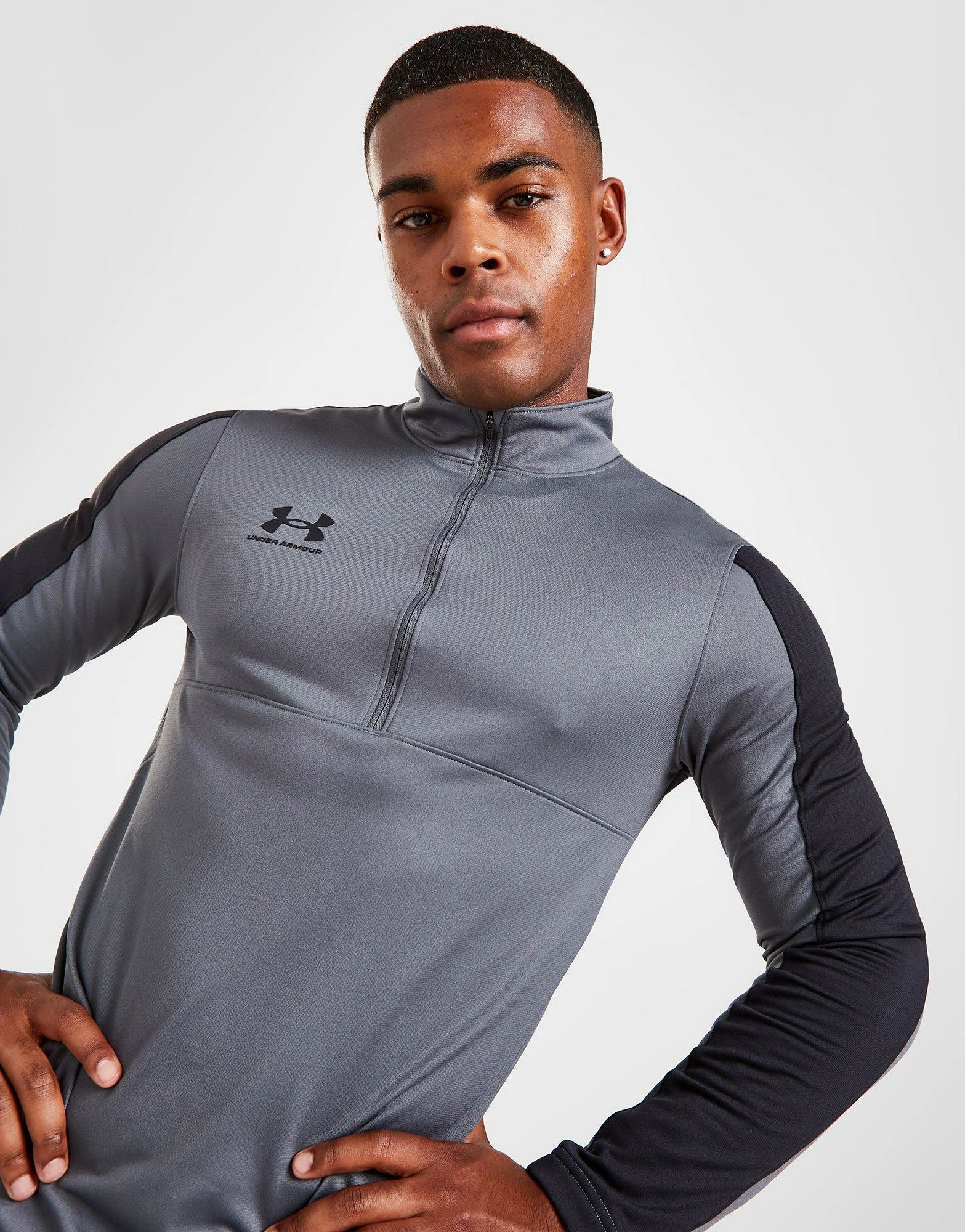 Level up your training in this men’s Challenger 1/2 Zip Top from Under Armour. Comin’ in a Pitch Grey colourway with Black colour block panels, this slim-fit top is made with ultra-smooth, lightweight poly fabric for lasting wear. Made with sweat-wicking tech for cool comfort, it features a 1/2 zip closure with a raised collar to adjust your airflow. Finished up with classic UA branding at the chest. Machine washable. | Our model is 6’0″ with a 40″ chest and wears a size medium.