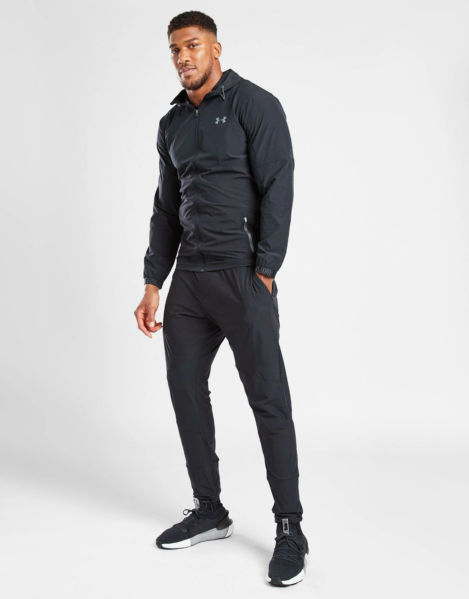 From the streets to the workout, rep these men’s Vanish Track Pants from Under Armour. Exclusive, these track pants are cut from smooth, durable poly fabric for lasting wear. In a Black colourway, they feature an elasticated waistband, with woven ankle cuffs to secure the fit. Finished up with Under Armour branding around the cuffs, and a signature logo at the thigh. Machine washable. | Our model is 6’0″ and wears a size medium.